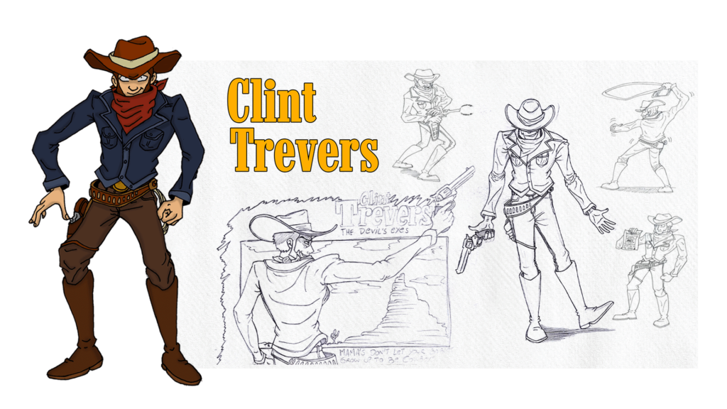 Clint Trevers is a kind of Old West bounty hunter, inspired by Clint Eastwood’s Man with No Name. I think I first sketched him while listening to Johnny Cash and Waylon Jennings—he’s deeply rooted in that gritty, western atmosphere.